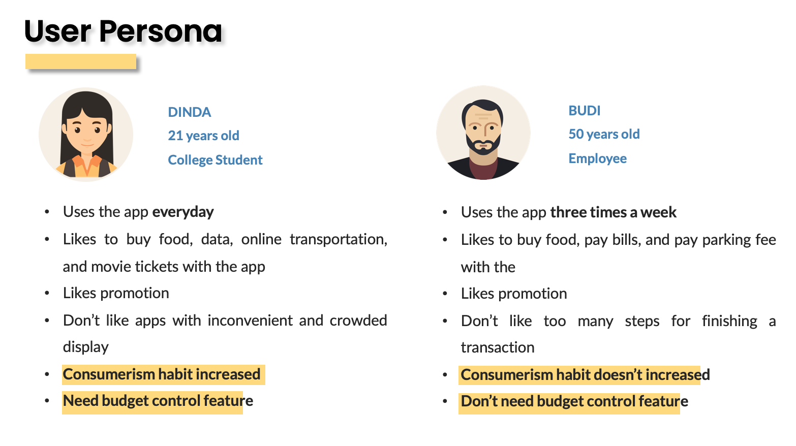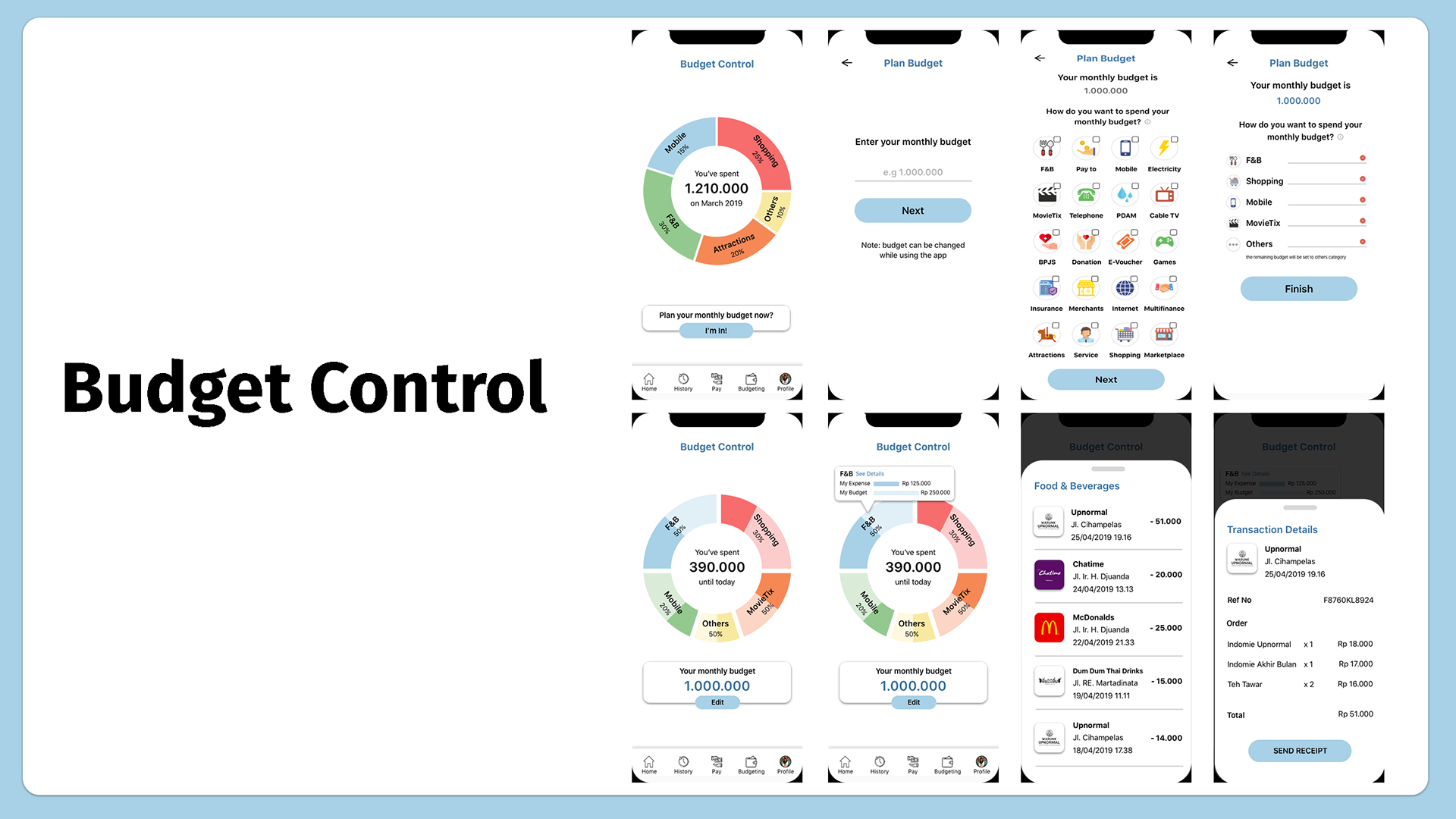 Budget Control feature let users see the recap of the user expenses in the month. If the user wants to set their monthly budget, the application will ask the user to fill the overall monthly budget they want. After that, the user is asked to choose the categories they want to allocate their budgets to. After the budget is set, the app will display a diagram that shows percentage comparison of user expenses and the budget that has been set.